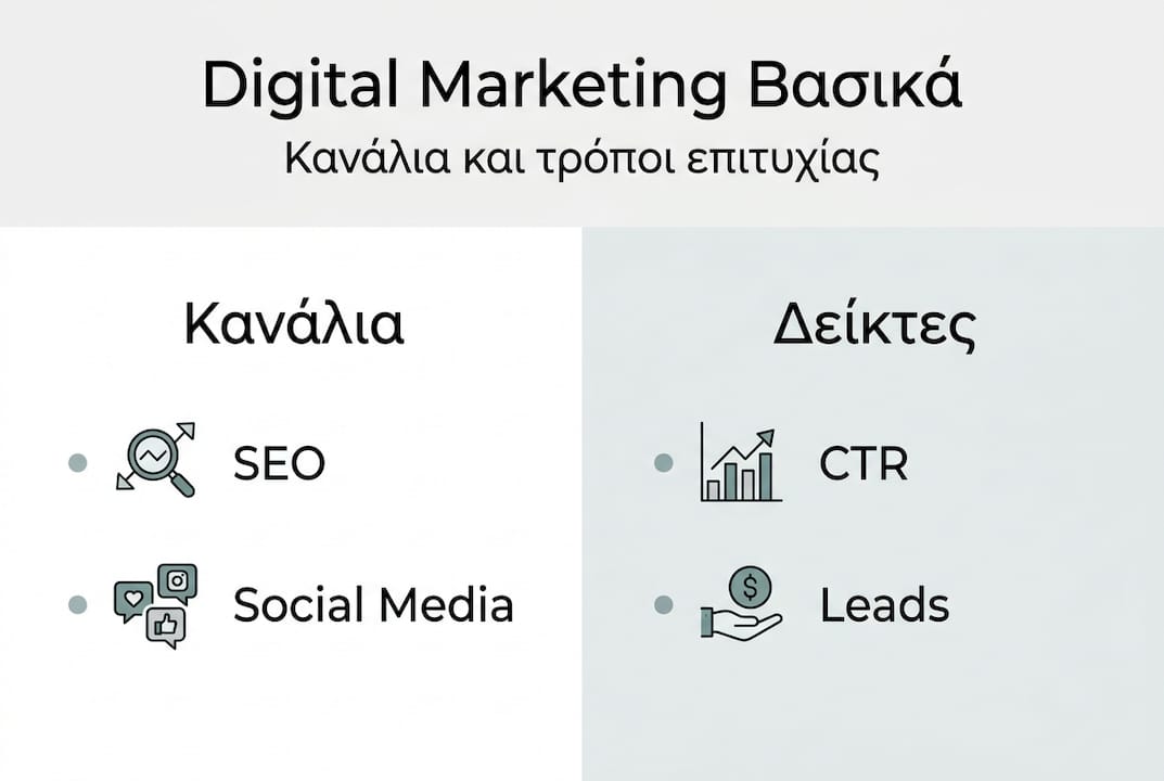 Πολλοί ιδιοκτήτες μικρών επιχειρήσεων πιστεύουν ότι αρκεί να ανεβάζουν φωτογραφίες στο Instagram ή να έχουν μια σελίδα στο Facebook για να «κάνουν digital marketing». Αυτή η αντίληψη κοστίζει χρόνο και χρήμα. Το πραγματικό ψηφιακό μάρκετινγκ δεν είναι παρουσία παντού, αλλά στρατηγική εστίαση σε συγκεκριμένα κανάλια με μετρήσιμα αποτελέσματα. Σε αυτό το άρθρο θα δείτε τι ακριβώς σημαίνει ο όρος, ποια εργαλεία υπάρχουν, πώς επιλέγετε αυτά που ταιριάζουν στην επιχείρησή σας και ποια λάθη πρέπει να αποφύγετε από την πρώτη μέρα.